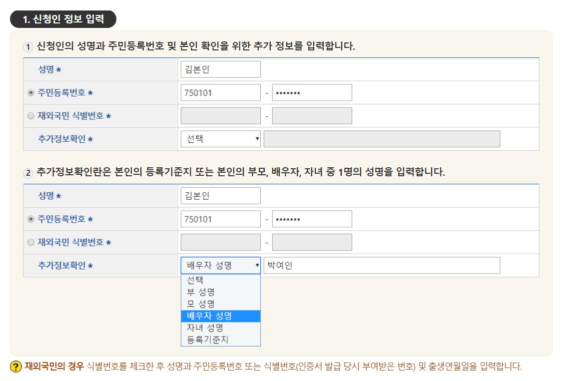 본인과 신청인이 선택을한 부,모,배우자,자녀등 대상자에 관한 사항
