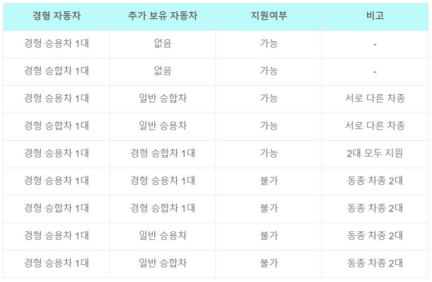 배기량 1,000cc 미만 경형승용차 및 경영승합차를 소유하는 자로서 주민등록표상 동거가족이 소유한 승용차 또는 승합차 각각의 합계가 1대인 경우이며 유가보조금 수혜대상자인 장애인 또는 국가유공자가 아니여야 합니다. 또한, 차량 길이 3.6m, 너비 1.6m, 높이 2.0m 이하로 모닝 및 레이, 캐스터, 트위지, 마티즈, 스파크, 다마스 코치 등이 해당차량이 됩니다.