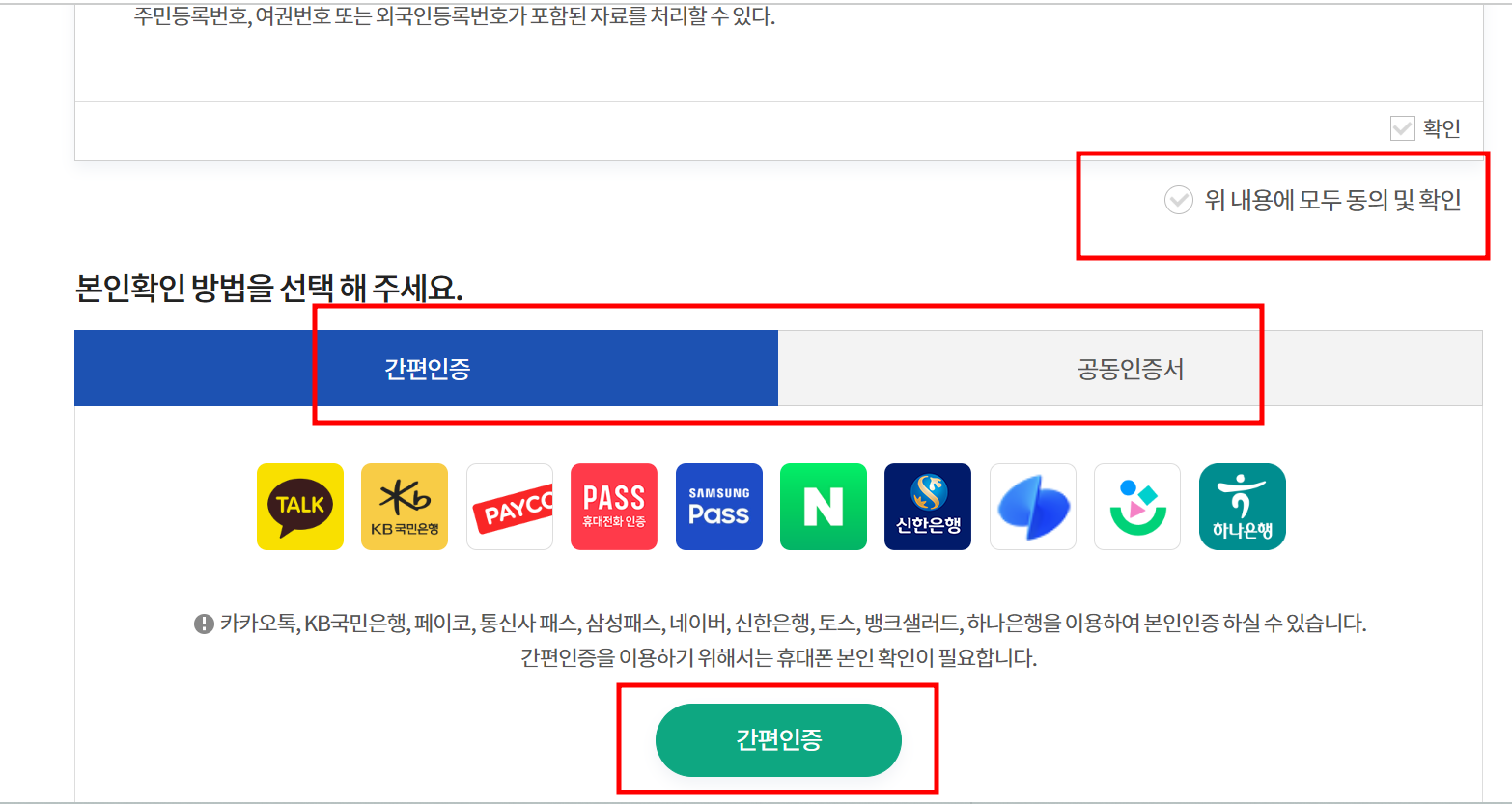 모두 확인을 한 다음 위 내용에 모두 동의 및 확인을 체크합니다.  아래의 본인 인증 절차를 진행합니다. 공인인증서가 있으면 공동 인증서를 선택하고 간편 인증이 가능하다면 편한 것으로 선택합니다.