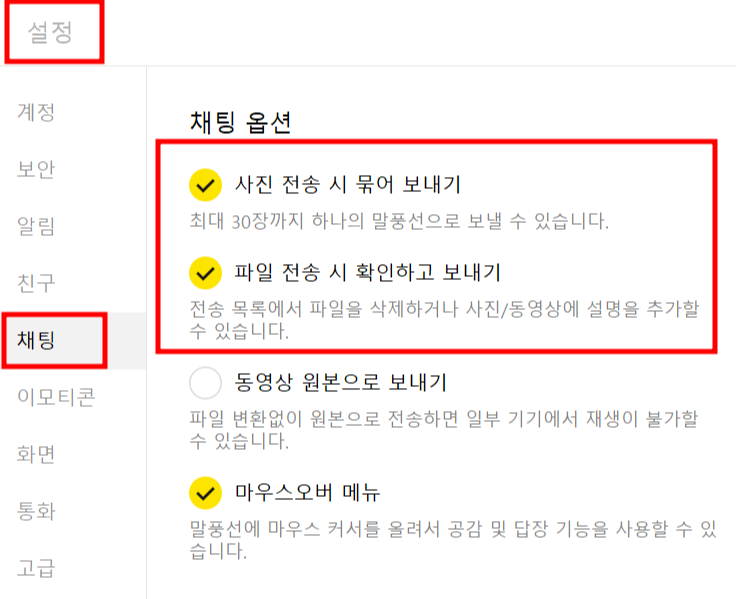 카톡 pc버전 사진 묶어보내기 기본 설정