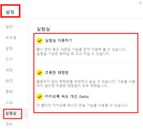 실험실 이용하기를 눌러주신 후에, 채팅방 조용히 나가기를 선택해 주세요. 단톡방 등에서 나가고 싶을때 아무런 흔적없이 나갈수 있게되어 한결 편리한 카카오톡이 가능합니다.