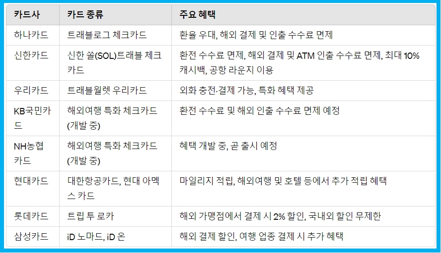 각 카드사는 독특한 혜택과 특징으로 경쟁하고 있어 소비자의 선택 폭이 넓어졌지요. 하나카드와 신한카드를 포함한 주요 카드사들의 트래블카드 혜택과, 여행자들이 카드를 선택할 때 고려해야 할 요소들을 비교해 알아볼게요.