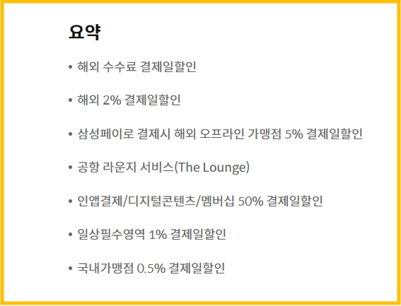 - 공항 라운지 이용도 가능하며, 국내 편의점 및 대중교통 할인 혜택도 포함되어 있다.