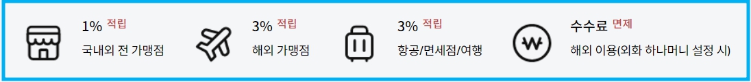 - 국내외에서 사용 시 한도 없이 2% 할인을 제공하며, 트래블월렛과의 제휴를 통해 해외 가맹점에서도 동일한 할인 혜택이 적용된다.