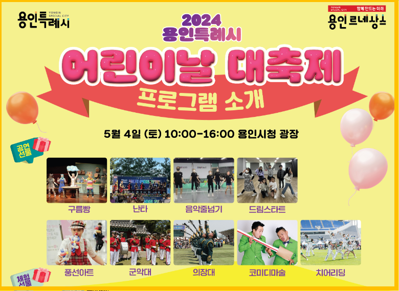 ▶ 주요 행사: 무대공연, 체험프로그램, 에어바운스, 기마대, 릭터 퍼레이드, 어린이 뮤지컬, 스포츠 체험 프로그램, 푸드트럭, 대형 캐릭터 포토존, 전광판 영화상영 등