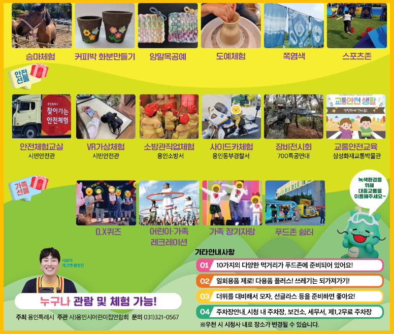 안전체험 :  VR 실감형 안전체험, 재난예방 화재안전교육/심폐소생술, 소방관직업체험, 교통안전 체험, 사이드카 체험, 장비 전시회, 교통안전교육.